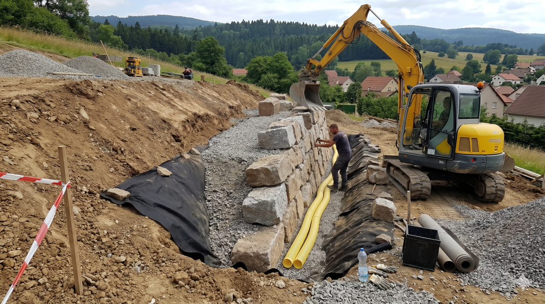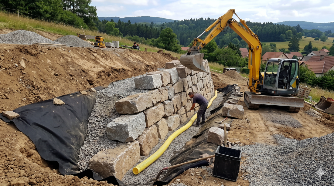 Mur de soutènement en enrochement réalisé à Châtenois : calage manuel de blocs de granit des Vosges, géotextile haute densité, inclinaison maîtrisée (fruit du mur), drainage performant et remblai technique, avec pelle mécanique 8 tonnes.