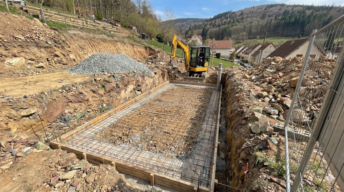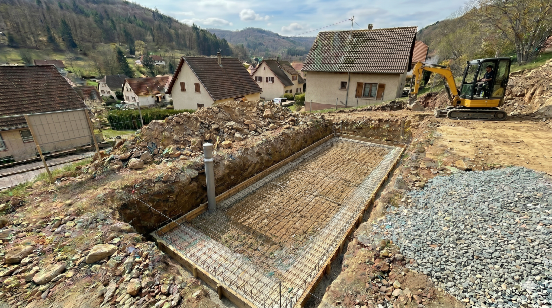 Terrassement précis d’une piscine à Villé sur terrain difficile : tracé au cordeau, radier de propreté, puits de décompression pour la nappe phréatique, remblai en gravier 10/20, évacuation des terres en centre de tri, accès mini-pelle.